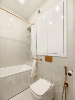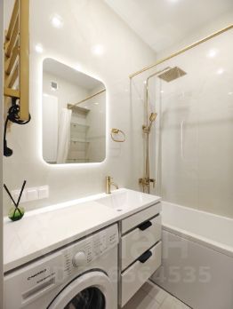 В ванной комнате установлена полноразмерная ванная, раковина со столешницей и местами для хранения по ней. Зеркало с сенсорной подсветкой. Электрический полотенцесушитель, стиральная машина, тропический душ, инсталляция, гигиенический душ. Теплый пол.