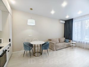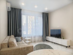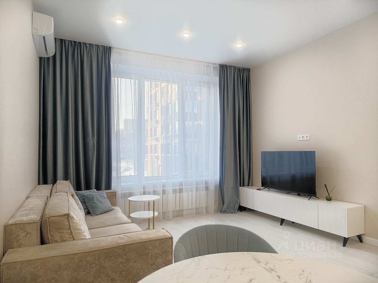 В гостиной зоне расположен удобный мягкий диван и журнальный столик, напротив которых размещен телевизор. Установлен кондиционер и блэкаут шторы.