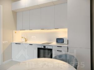 На кухне установлен качественный кухонный гарнитур со встроенным холодильником, морозильной камерой, варочной панелью, духовым шкафом. Также имеется посудомоечная машина, микроволновая печь, фильтры для питьевой воды и подсветка рабочей зоны. Круглый кухонный стол с комплектом мягких стульев.