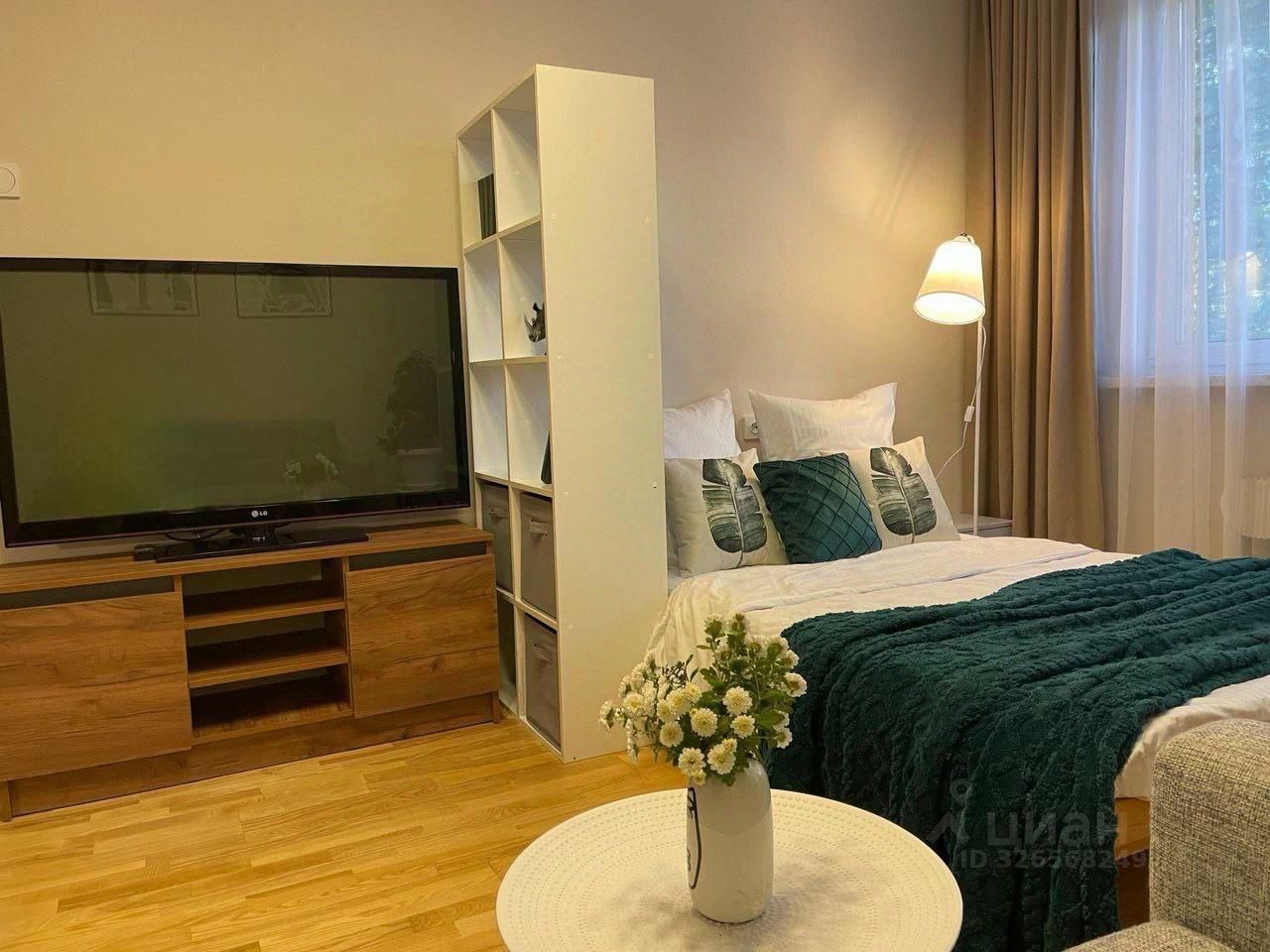 Просторная комната с грамотным зонированием: спальная зона с кроватью 140 см, гостиная с диваном и большим телевизором, а также отдельная рабочая зона с удобным креслом.