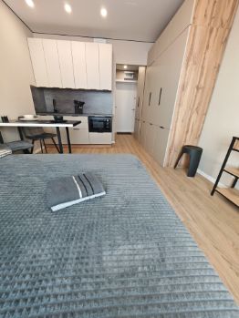 Уютная двуспальная кровать, шкаф для хранения вещей, шторы Блэк -аут. Обеденная зона: стол, стулья. Полноценная кухня: мойка, варочная панель, встроенный холодильник и свч-печь; достаточно мест для хранения.