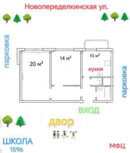 Характеристики объекта: Общая площадь 58 м², комнаты 20 м² и 14 м², кухня 10 м². + балкон.