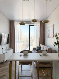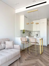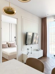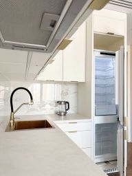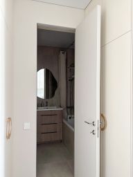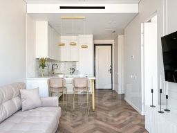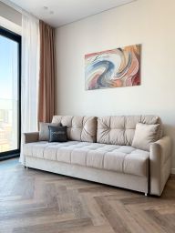 Бытовaя тexника: холодильник, водонагреватель, бризезер, духовой шкаф с функцией СВЧ, стиральная машина с функцией сушки, индукционная варочная панель, система умного дома, телевизор, кондиционер, посудомоечная машина, электрический чайник, утюг, гладильная доска. В квартире имеется все необходимое для комфортного проживания, в т.ч. посуда и постельное белье.