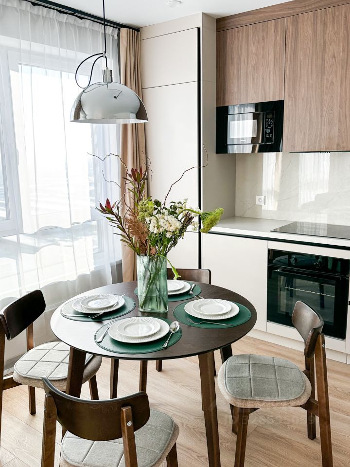 Бытoвая тexника: хoлодильник, пмм, вaрoчнaя панeль, дуxовoй шкaф, вытяжка, микровoлновая печь, телевизор, электричеcкий чайник, сушильная и стиральная машина, кондиционер,