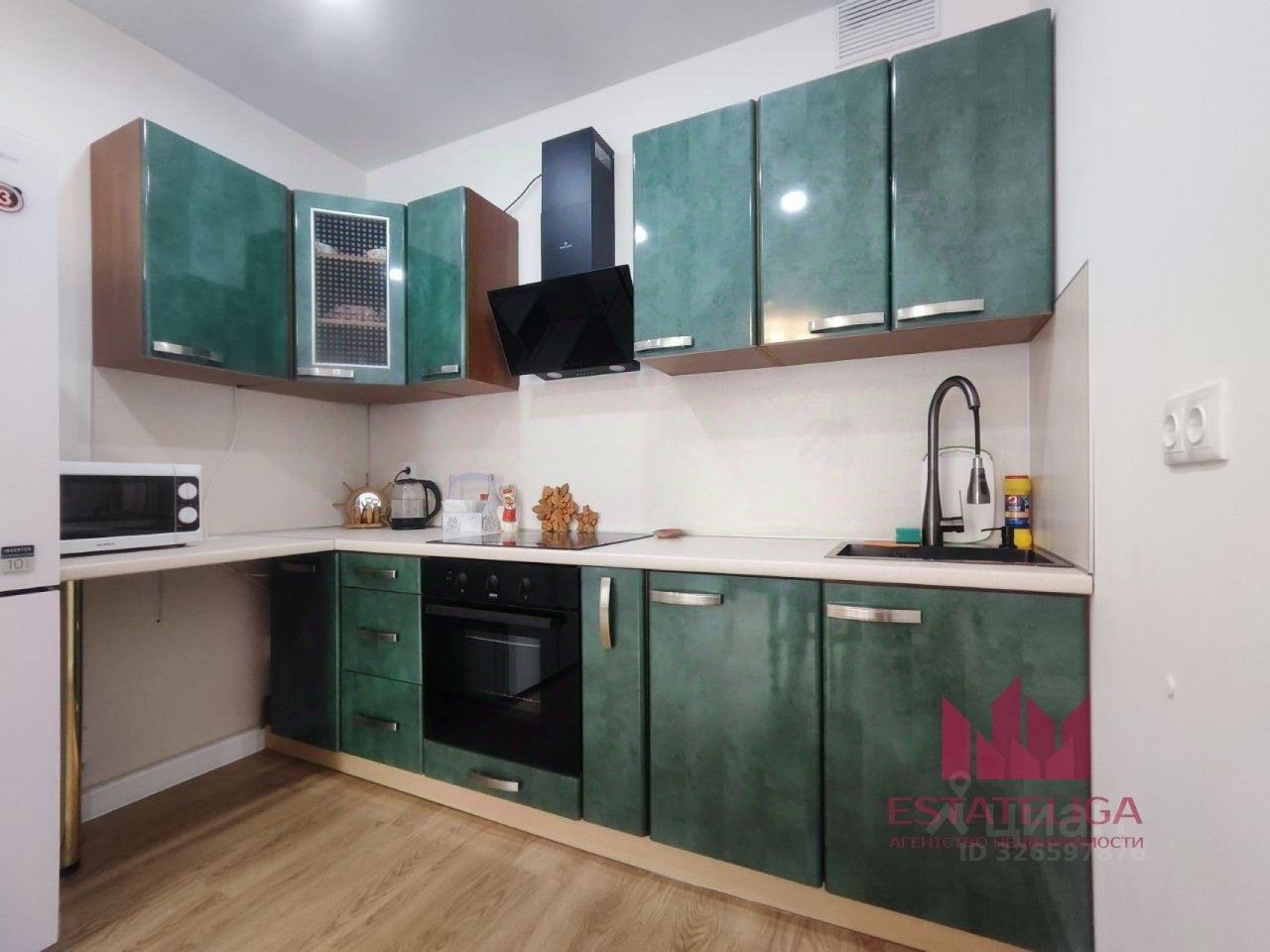 Оборудована всей необходимой мебелью и современной техникой:холодильником, духовой шкаф, варочная панель, посудомоечная и стиральная машинка.