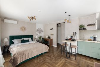 Здесь, вы почувствуете себя как дома, есть все необходимое для жизни: удобная кровать, кухня, бытовая техника (стиральная машинка, холодильник, микроволновая печь, чайник, кофемашина, варочная панель, вытяжка, утюг), санузел с тёплым полом.