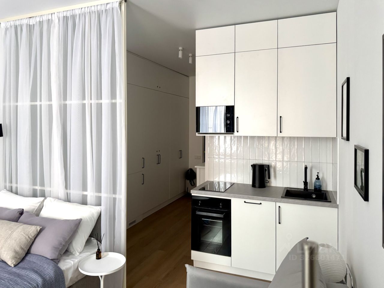 В студии есть все необходимое для жизни - места хранения , полноразмерный холодильник, кровать 140 см с подьемным механизмом, духовой шкаф, посудомоечная машина, СВЧ печь, стиральная машина .