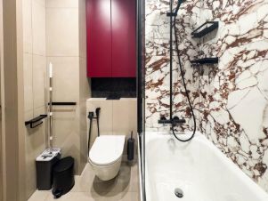- Ванной комнате: стирально-сушильной машиной, зеркалом, ванна, санузел с гигиеническим душем, и теплый пол.