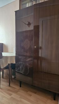 В спальне стоит тахта, по запросу приобретём матрас, шкаф для одежды и стол.