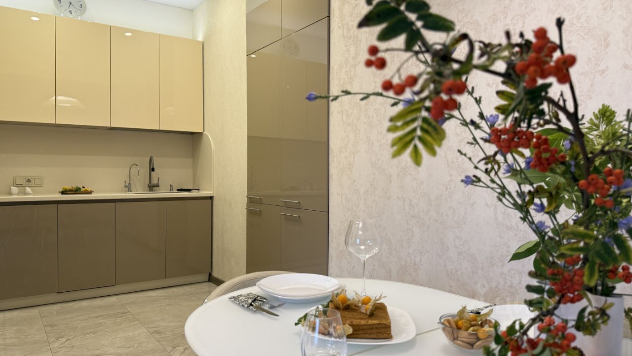 Кухня: кухонный гарнитур с большим встроенным холодильником, встроенной морозильной камерой, посудомоечной машиной, варочной панелью, фильтром для воды, духовым шкафом, обеденной группой и вытяжкой.