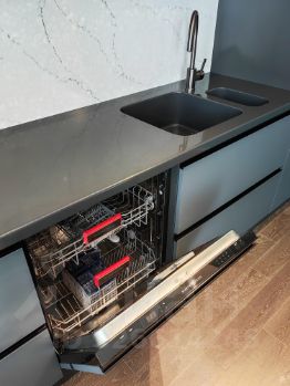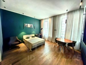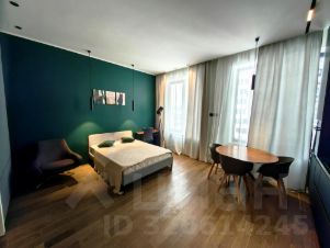 Шикарная кухня-гостиная-спальня со встроенной техникой (посудомойка, духовой шкаф, холодильник, плита, вытяжка). Окна во двор на зеленую линию парка. Двуспальная кровать, встроенные шкафы, обеденная зона и письменный столик.