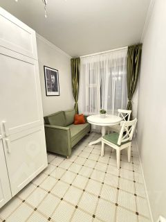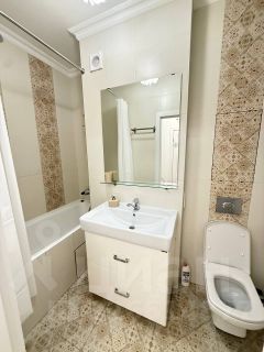 В квартире выполнен косметический ремонт, что создаёт атмосферу уюта и свежести. Высота потолков 2.8 метра. Просторная кухня площадью 12 кв. м позволяет удобно готовить и принимать пищу. В комнате и на кухне есть вся необходимая мебель. Диван на кухне раскладной, ещё одно спальное место для гостей.Из техники: кондиционер, холодильник, 2 телевизора, стиральная машина, чайник, микроволновая печь. Санузел совмещённый, оборудован ванной. Дом теплый,радиаторы регулируются, теплый пол в зимний период. Окна выходят во двор, что обеспечивает тишину и спокойствие. Имеется консьерж.