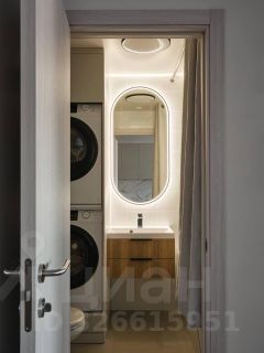 - стиральная машина, сушильная машина, ванна, рейл и штора для ванны, раковина с тумбой для хранения, полки для хранения, зеркало с подсветкой, унитаз