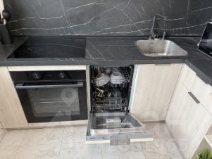 Кухня оснащена всей необходимой техникой: встроенная варочная панель, духовой шкаф, вытяжка, посудомоечная машина, микроволновая печь, аэрогриль, капсульная кофемашина и большой холодильник с морозильной камерой. В наличии полный комплект посуды и столовых приборов на 4 персоны. Современное освещение и стильная мебель дополняют интерьер.