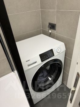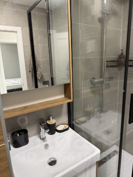 Санузел совмещенный, оборудован душевой зоной с термостатом и эффектом тропического дождя, а также стиральной машиной — всё для максимального комфорта.