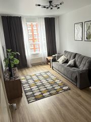 Квартира с хорошим ремонтом и функциональной планировкой с отдельной просторной гардеробной комнатой и балконом. Из техники есть все необходимое для комфортного проживания: кондиционер, холодильник, духовой шкаф, посудомоечная и стиральная машины, а также телевизор. Из мебели в комнате есть удобный раскладывающийся диван, рабочий стол (без стула), тумба под телевизор и журнальный столик. В квартире проведен интернет, есть Wi-Fi, а также выведен интернет кабель к рабочему столу.