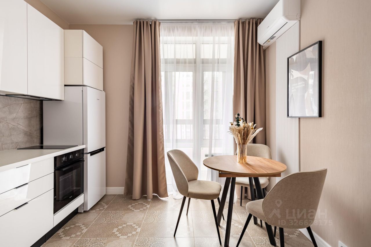 Сдаётся уютная однокомнатная квартира в новом доме рядом с метро Прокшино. Общая площадь квартиры составляет 35 кв. м, из которых 20 кв. м — это жилая зона и 9 кв. м — просторная кухня. Квартира находится на 5 этаже 15-этажного дома, построенного в 2024 году. Из окон открывается вид во двор и на улицу, что обеспечивает хорошее естественное освещение.