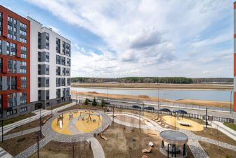 Во дворе есть спортивная детская площадка. Дом находится в районе с развитой инфраструктурой. Вид из окон на озеро и лес.