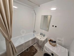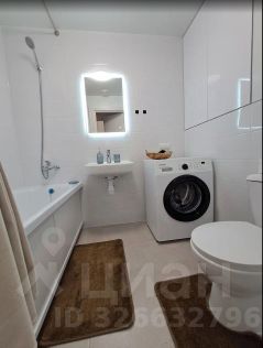 Ванная комната облицована плиткой, новая сантехника, стиральная машина, встроенный шкаф для хранения, зеркало с подсветкой.