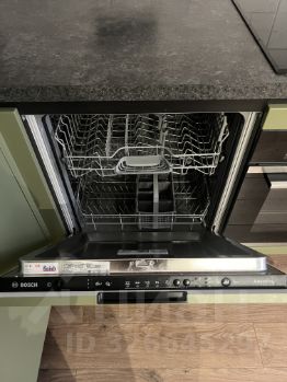 Объединенная кухня-гостиная укомплектована всей необходимой встроенной техникой (холодильник, посудомоечная машина, духовка, варочная панель).