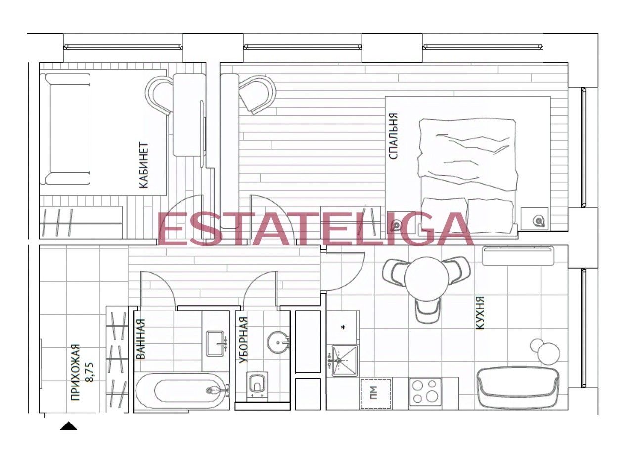 Функциональная планировка квартиры: просторная кухня, изолированная спальня на 3 окна, вторая спальня/кабинет, раздельный санузел с ванной, холл с местами для хранения.