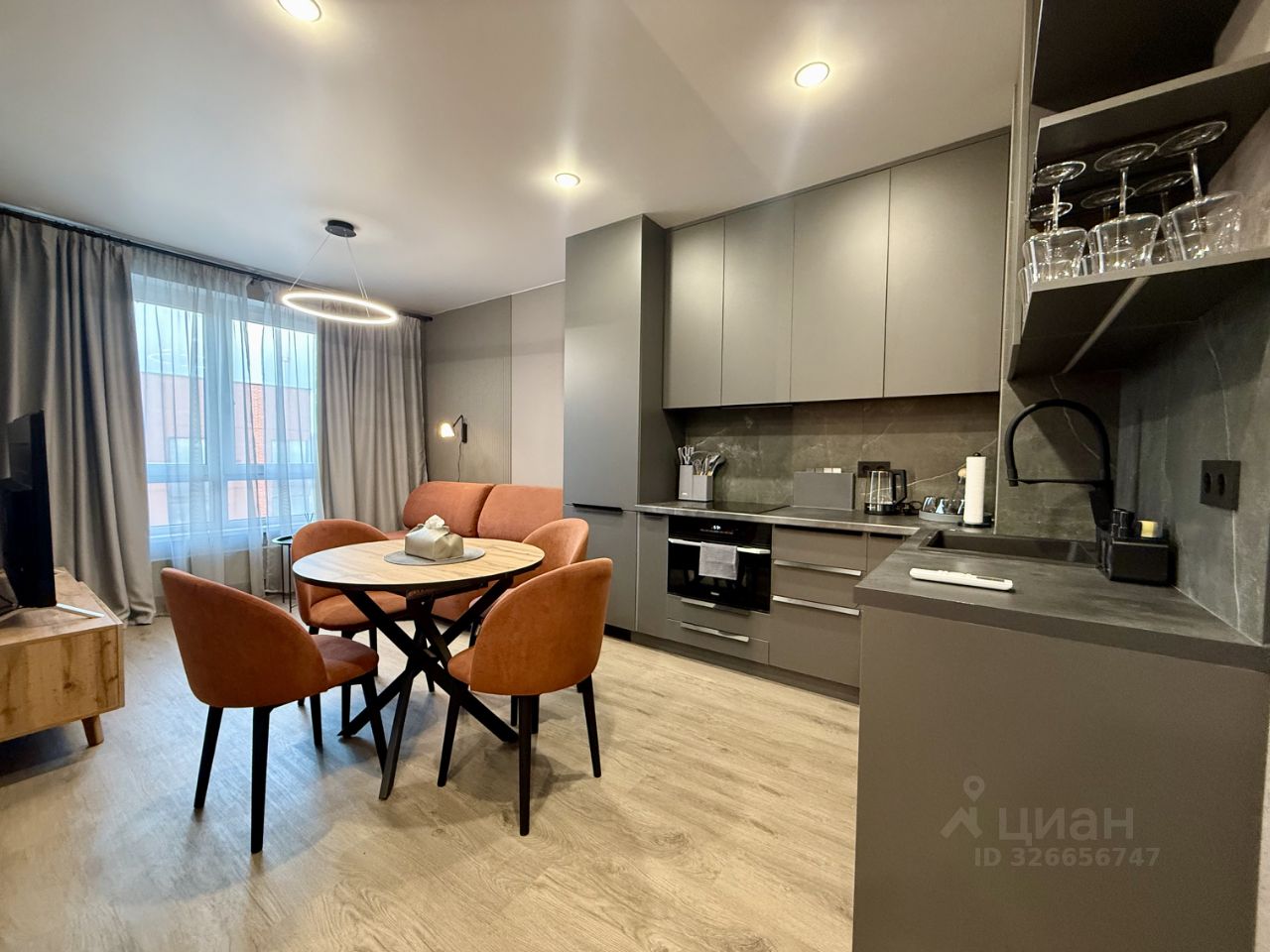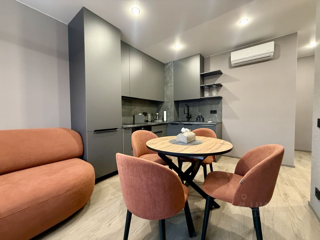 Гостиная зона оборудована диваном, который в разложенном виде превращается в полноценное спальное место. Установлен смарт-TV с возможностью управления Алисой, обеденная зона с удобными креслами. Есть комплект посуды.