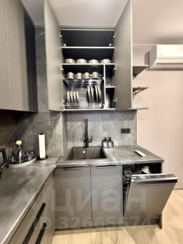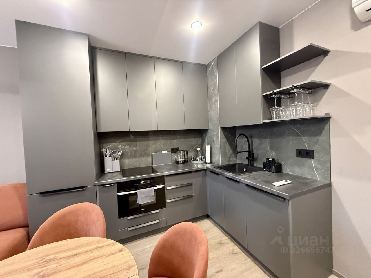 Кухня-гостиная 15,3 кв. м. оборудована современной кухней со встроенной техникой Haier (встроенный холодильник, духовка/свч, посудомоечная машинка, варочная панель, вытяжка). Установлены фильтры для питьевой воды.