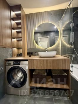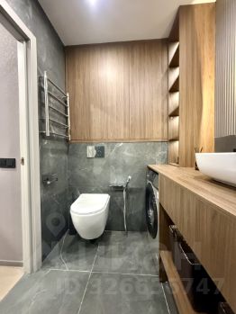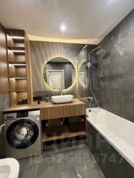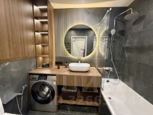 Великолепный санузел, оборудованный подвесным унитазом-инсталляцией, гигиеническим душем, ванной, стиральной машиной, и вместительными шкафчиками.