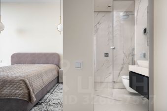 Спальня оснащена двумя полноразмерными шкафами, кроватью с премиальным ортопедическим матрасом, прикроватными тумбами из натурального дерева и бьюти-пространством с специализированным косметическим столиком.