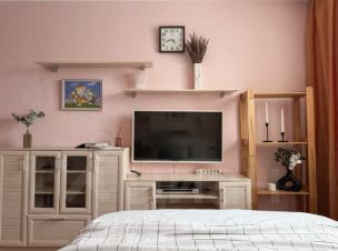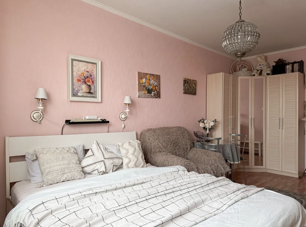 Планировка квартиры продумана и удобно зонирована. В спальне организовано пространство для отдыха и работы: установлена удобная кровать, кресло, телевизор и рабочий стол. Для хранения предусмотрены вместительный шкаф, комод и стеллажи. Кухня разделена на обеденную зону и зону отдыха с диваном и телевизором. Из окон открывается приятный вид на город.