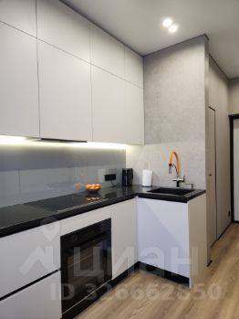 Кухня оборудована современной техникой: встроенный холодильник, индукционная плита, вытяжка, микроволновая печь и посудомоечная машина.