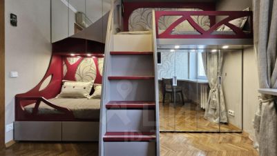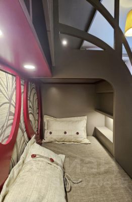Детская комната тоже по индивидуальному проекту, с двумя кроватями в разных уровнях, интегрированным зеркальным шкафом, полочками, нишами и выдвижными ящиками. Письменный стол выполнен, как продолжение подоконника.