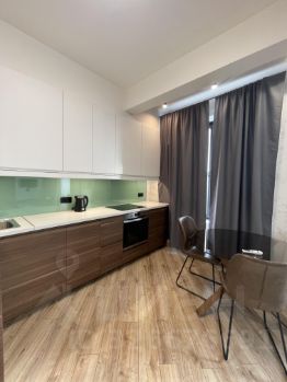 Кухня: встроенный кухонный гарнитур со встроенной бытовой техникой: двухкамерный холодильник Hansa; варочная поверхность и духовой шкаф Electrolux; вытяжка Teka; микроволновая печь Samsung; посудомоечная машина Electrolux; встроенная стиральная машина Indezit; кондиционер Electrolux; стол и стулья;