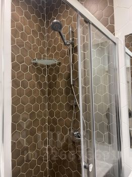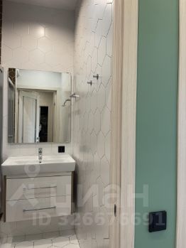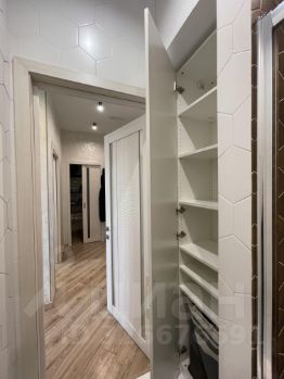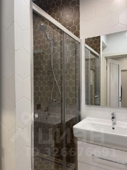 В душевой: встроенный шкаф, зеркало, тумба под раковиной;