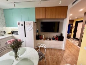 - Кухня-гостиная: Просторная кухонная зона вдоль окна с теплым полом. Кухня сделана на заказ, ящиков для хранения столько, что влезет всё и даже больше. Есть посудомойка, кофемашина и большой ТВ с аудиосистемой. Диван раскладывается в полноценное спальное место.