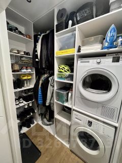 - Система хранения и постирочная: В квартире две гардеробные. Одна из них выделена под хозблок-постирочную со стиральной и сушильной машинами (белье не нужно развешивать по комнатам). Также есть встроенные шкафы в каждой зоне и лоджия для хранения велосипедов