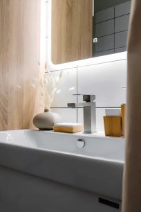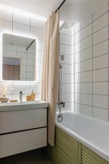 В ванной комнате много места для хранения - встроенный шкаф для бытовой химии и ниша с открывающимся экраном под ванной.