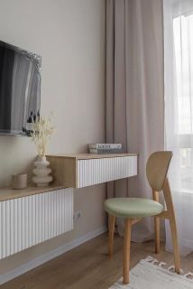 Функциональная планировка: просторная кухня-гостиная со встроенным кухонным гарнитуром и зоной отдыха - раскладываемый диван (спальное место 160х200), подвесная консоль с ящиками для хранения. В квартире есть вся необходимая техника для комфортного проживания: в кухне-гостиной - телевизор, кондиционер, посудомоечная машина, духовой шкаф, индукционная варочная поверхность, встроенные холодильник и микроволновая печь; в ванной комнате - стиральная и сушильная машины. Кухонный стол раскладывается на 8 персон.