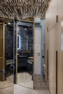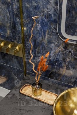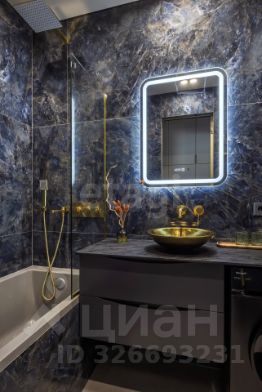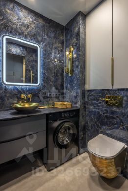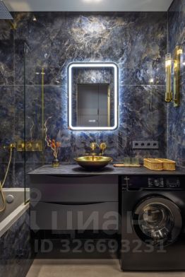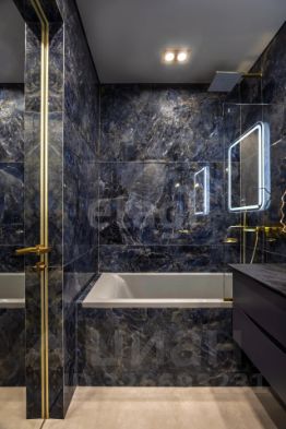 Санузел выполнен в насыщенном мраморном ИНДИГО в сочетании с ЗОЛОТОМ, создавая настроение роскоши и глубины. Сантехника - Италия Потолок- эксклюзив (авторская работа).