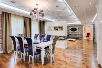 Просторная гостиная-трансформер, объединенная с обеденной зоной и эргономичной кухней — идеальное пространство для семейных вечеров.