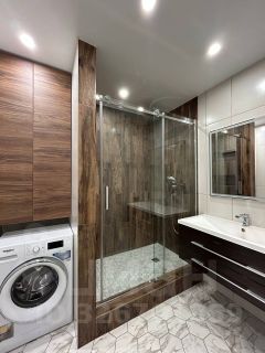 Санузел: современный санузел с просторной душевой кабиной, стиральной машиной и местом для хранения.