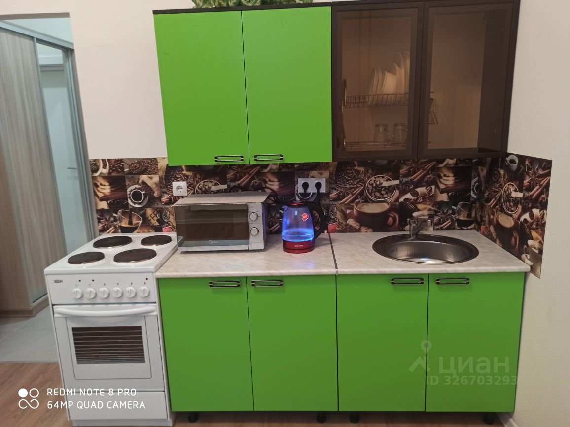 Оснащена необходимой мебелью и современной качественной техникой, всё в отличном состоянии: встроенный кухонный гарнитур, большой раскладной диван, БЕСШУМНЫЙ двухкамерный холодильник, электрическая плита, свч-печь, вешалка металлическая для одежды, вместительный шкаф купе,стеллаж, компьютерный стол. Санузел совмещённый, душевая. Панорамные окна во двор, ландшафтный дизайн. За счёт высоких потолков квартира очень светлая,уютная,просторная.