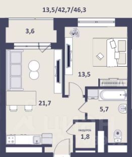 Квартира располагается на 11 этаже. Общая площадь 46,3 кв.м., в том числе спальня 13,5 кв.м., кухня-гостиная 21,7 кв.м., лоджия 3,6 кв.м., санузел совмещенный 5,7 кв.м., гардероб 1,8 кв.м.