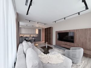 - Гостиная оснащена , стильным журнальным столиком, раскладным угловым диваном, креслом и пуфиком и мультимедиа.