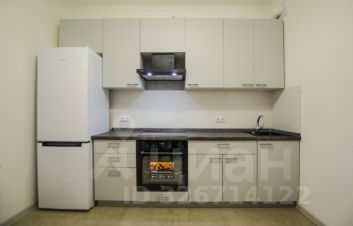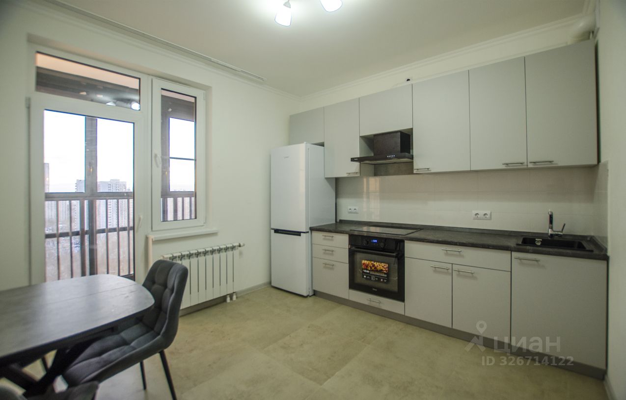 В просторной кухне с выходом на застекленный балкон - функциональное рабочее место, оснащенное современной бытовой техникой, включая духовую печь и варочную панель под единой столешницей, вытяжку, двухкамерный холодильник.
