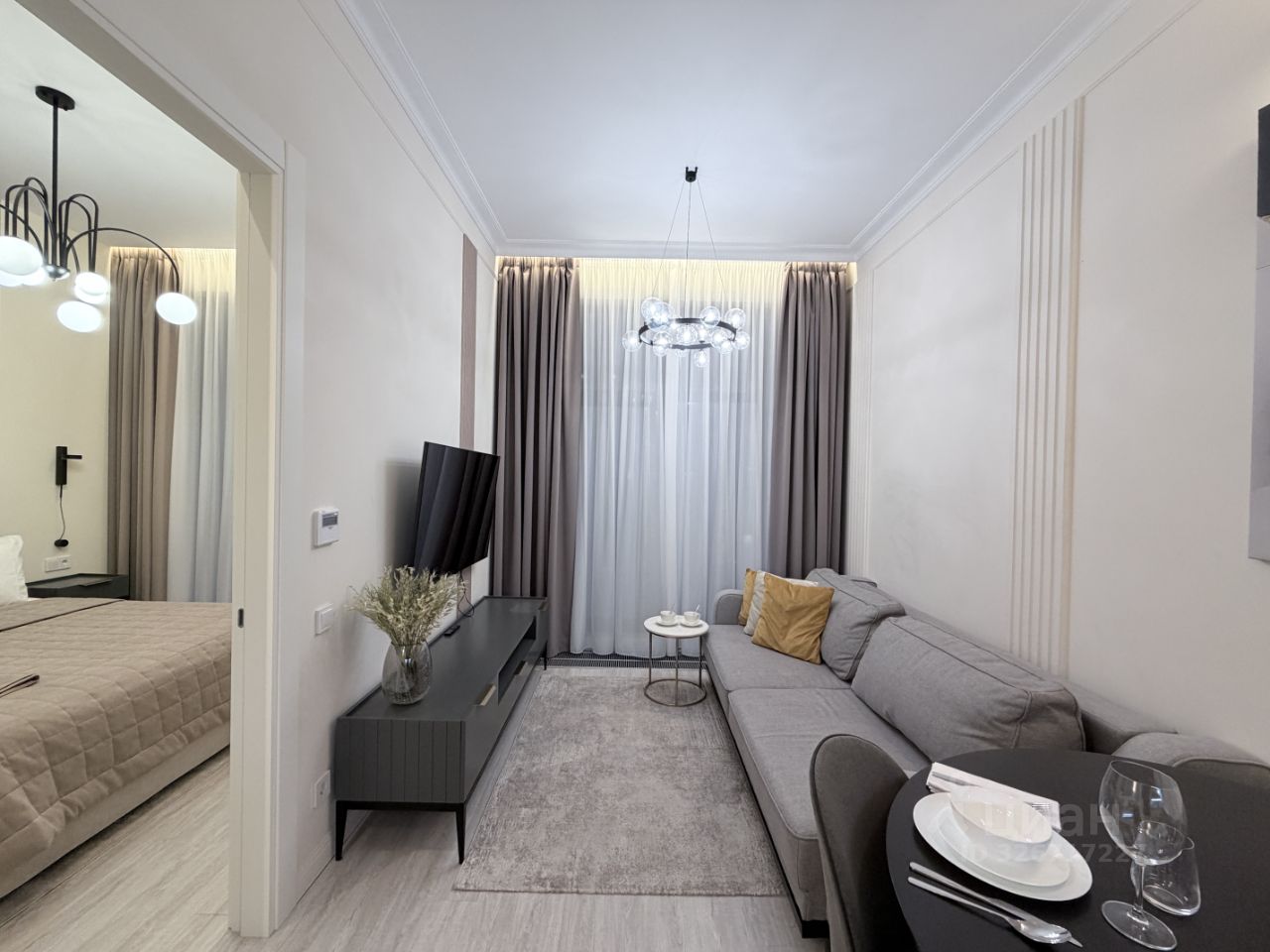 - гостиная зона оснащена раздвижным дизайнерским диваном, тв-тумбой и телевизором 55 дюймов;
