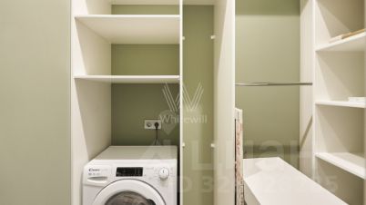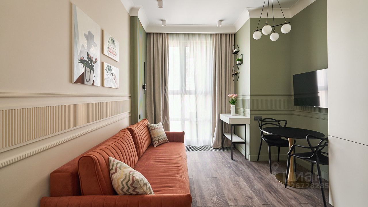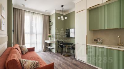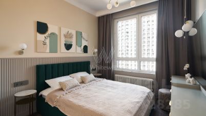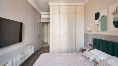 Уютная квартира с 1-й спальней общей площадью 38 м² в комплексе бизнес-класса "Вереск". Выполнен новый дизайнерский ремонт в неоклассическом стиле в пастельных тонах. Панорамное окно в гостиной наполняет пространство естественным светом. Окна выходят в тихий двор. Спланирована кухня-гостиная с раскладным диваном, изолированная спальня с вместительным шкафом, гардеробная с постирочной зоной, санузел с душевой, прихожая с гардеробной у входа.
