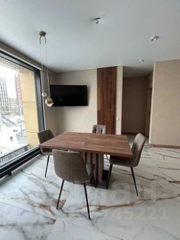 В гостиной установлен большой телевизор, а также стильный обеденный стол с современными стульями. Спальня оформлена в светлых тонах с акцентом на удобную кровать и большие окна, которые наполняют комнату естественным светом.