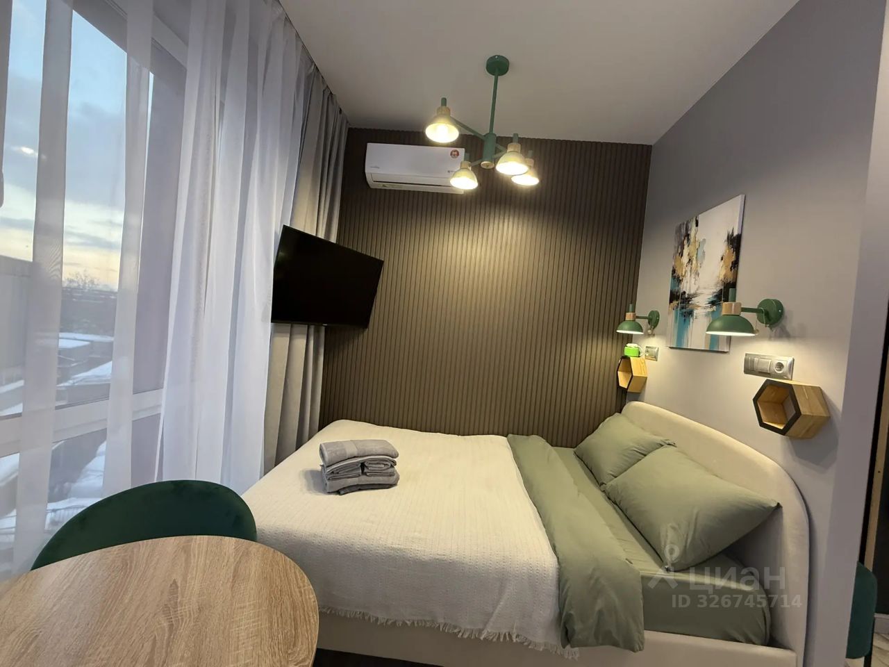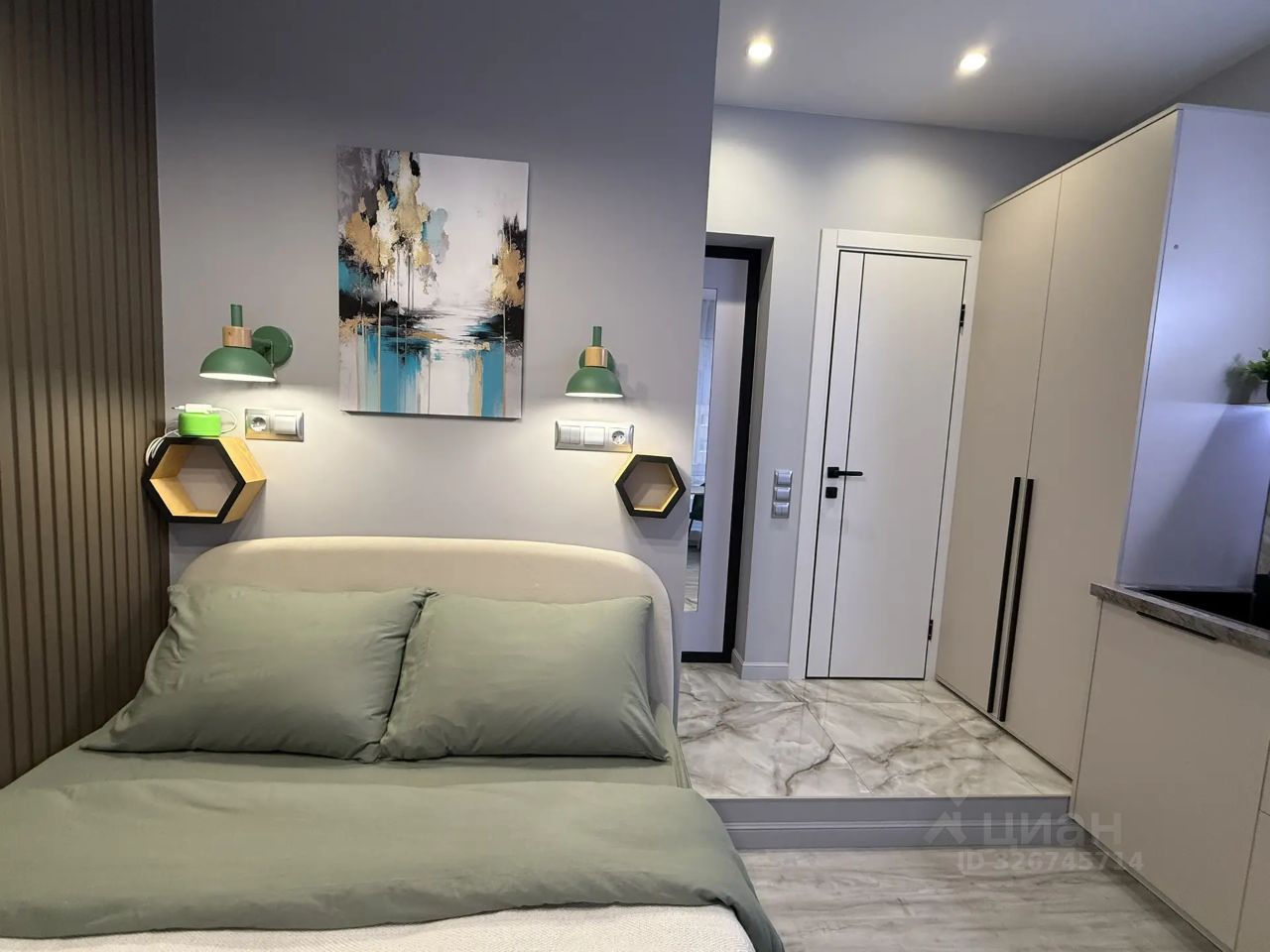 Интерьер выполнен в модных серо-бежевых оттенках с зелёными акцентами, красивым освещением и дизайнерскими деталями. В квартире приятно находиться — всё новое, чистое и продумано до мелочей.