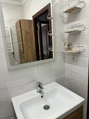 В квартире сделан качественный евроремонт, здесь есть всё необходимое для комфортного проживания: мебель на кухне и в комнатах, а также вся необходимая техника — кондиционер, холодильник, посудомоечная и стиральная машины. Высота потолков составляет 2,55 метра. Планировка квартиры включает один совмещённый и два отдельных санузла с ванной и душевой кабиной. Из окон открывается вид как на улицу, так и во двор. Есть четыре балкона, что позволяет наслаждаться свежим воздухом и видами города.